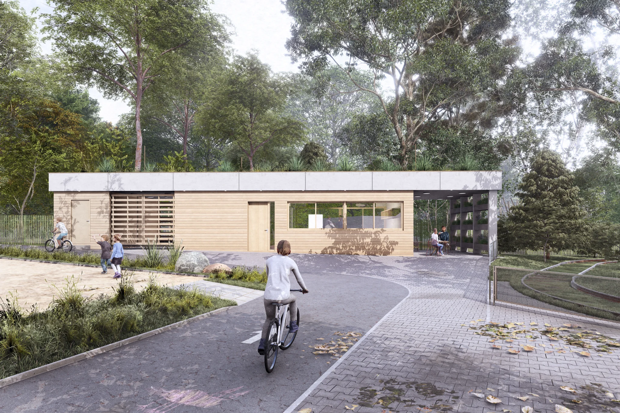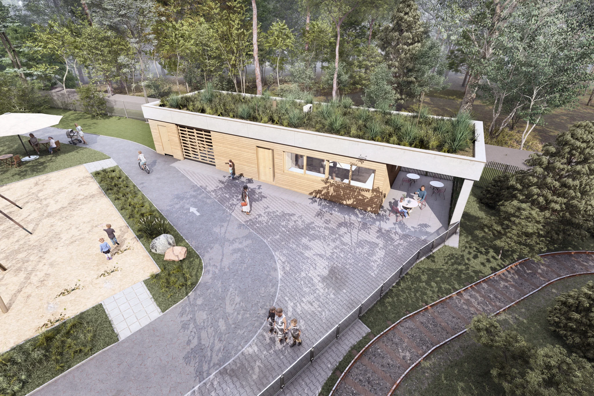 Díky pásovému posuvnému prosklení je možný výdej z bistra směrem do dětského koutku, ale také do cesty u lesoparku. Truhlíky na pobytové terase jsou inspirací a edukací pro návštěvníky bistra, kteří se zde mohou seznámit s vhodnými druhy rostlin pro pěstování v domácnosti nebo na zahradě.